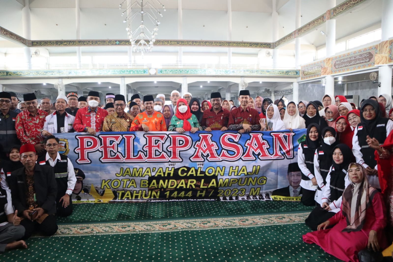 Reportika.co.id || Bandar Lampung – Walikota Bandar Lampung, Eva Dwiana melepas persiapan keberangkatan calon jemaah haji (CJH) masyarakat setempat di Masjid Agung Al-Furqon, Kamis, 25 Mei 2023.