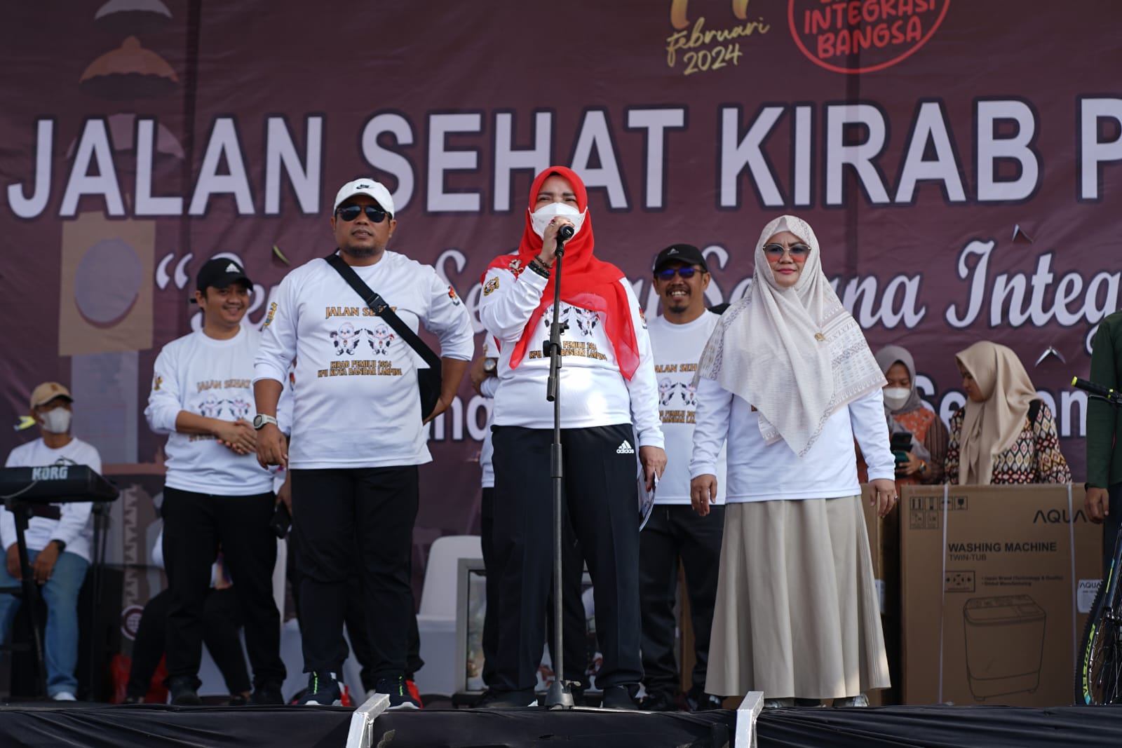 “Alhamdulillah semua rangkaian Kirab Pemilu selesai. Tujuannya agar partisipasi pemilu 2024, bisa mencapai target 80 persen,” jelasnya.Terlihat juga berbagai hadiah menarik yang akan dibagikan kepada peserta jalan sehat. Mulai dari sepeda, kulkas hingga hadiah utama umrah.